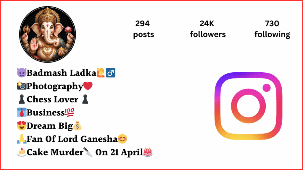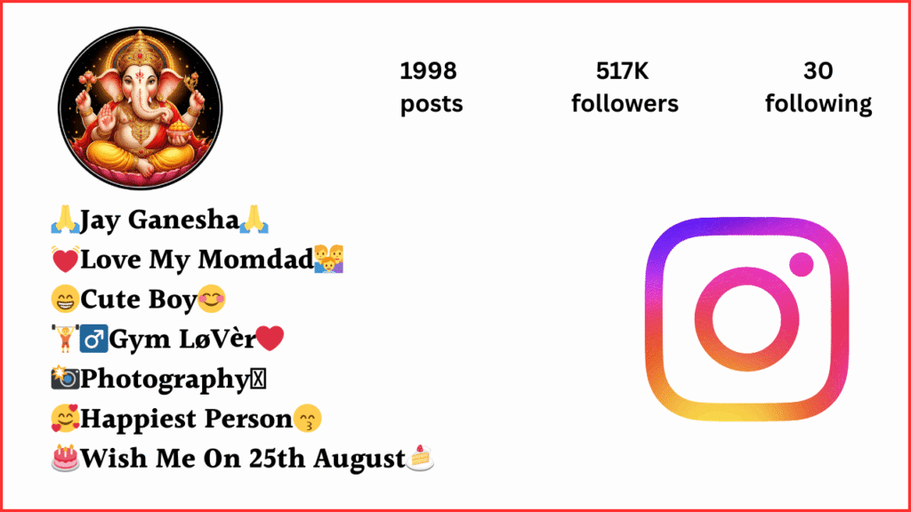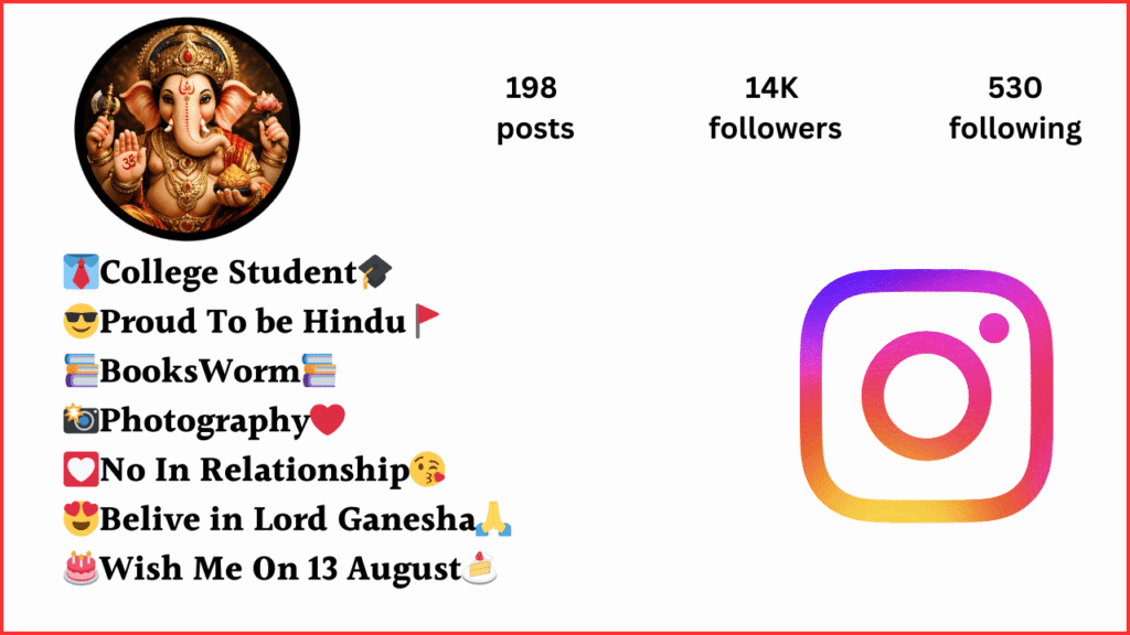 दोस्तों, इस पोस्ट के ज़रिये हम आपके लिए Ganpati Bappa Bio For Instagram का एक शानदार और चुनिंदा कलेक्शन लेकर आए हैं। अगर आप भी सच्चे गणपति भक्त हैं, तो अपने इंस्टाग्राम प्रोफाइल पर गणपति बाप्पा से जुड़ा बायो ज़रूर लगाना चाहिए। यहाँ आपको Ganpati Bhakt के लिए Instagram Bio, Ganpati Bappa Lover Bio और कई तरह के यूनिक Ganpati Bappa Instagram Bios मिलेंगे।